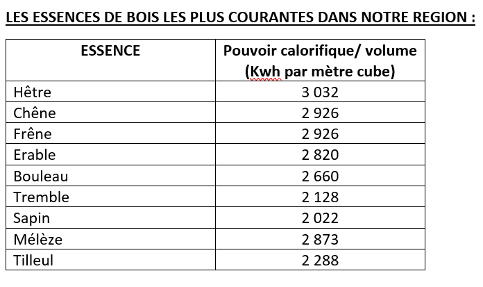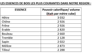 Les valeurs calorifiques : ce sont des moyennes calculées avec des arbres de tout pays, et les variations peuvent être importante pour chaque essence. Les écarts viennent de la vitesse de croissance, l’altitude, les conditions climatiques, une terre pauvre ou riche ou humide, etc....