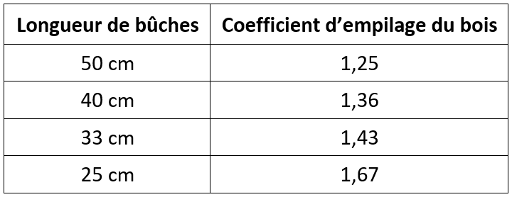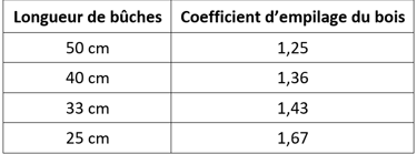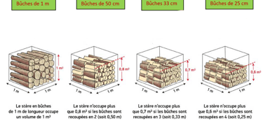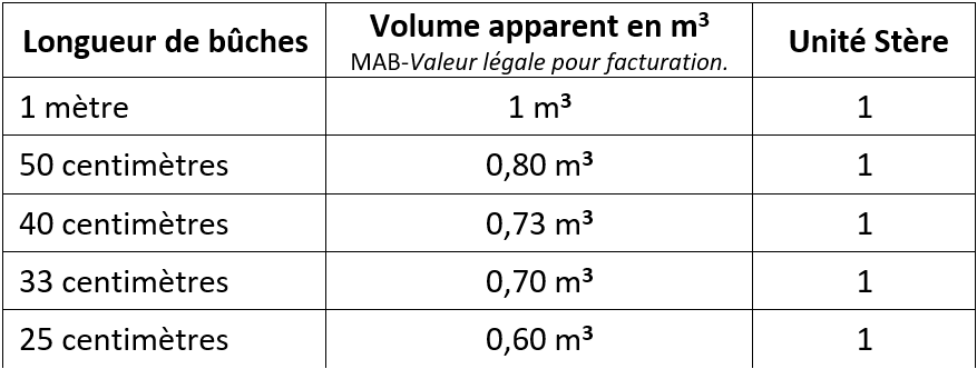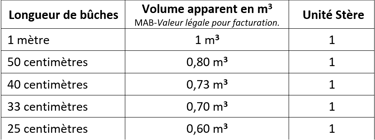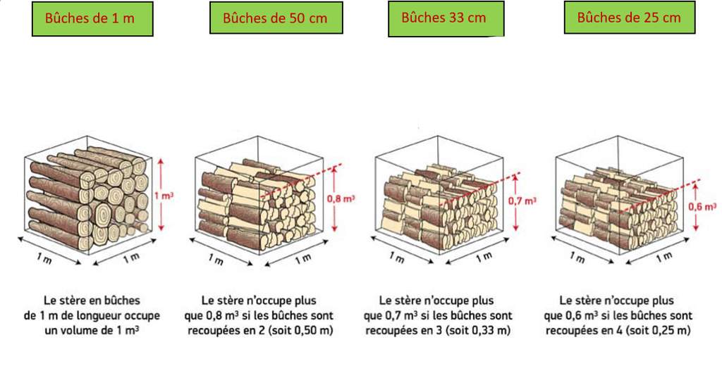o Si les bûches font 50 cm, le stère (=1), occupe 0.80 m3 apparent (MAB).