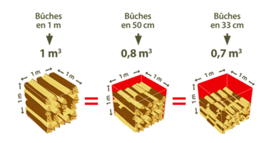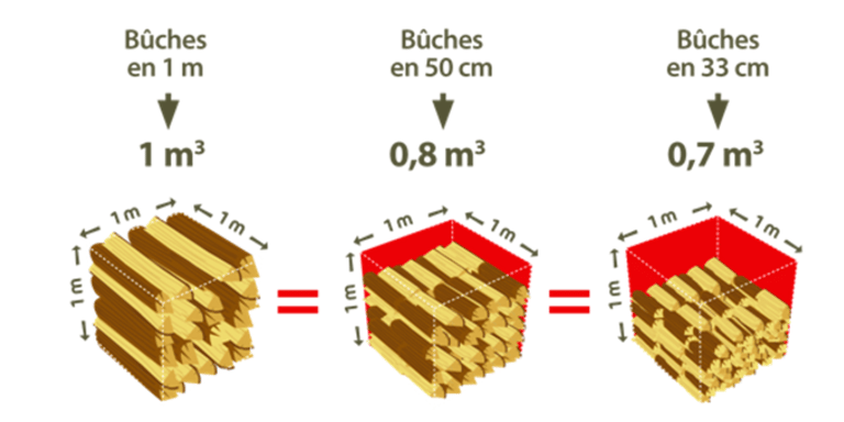 o Si les bûches font 33 cm, le stère (=1), occupe 0.70 m3 apparent (MAB).